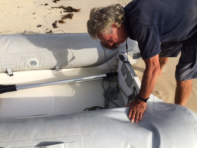 Fighting with the drain and another hole somewhere we started to bail out the dinghy. We used shoes, a snorkel mask and two water bottles. My water bottle was a lame bailer because it had a narrow mouth opening.