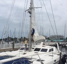 In the photo above, Brad, who is heavily involved with the refits, is going up the mast. Pat Reischmann of Hy-Tech Marine is standing to the left of the mast in the yellow shirt.
