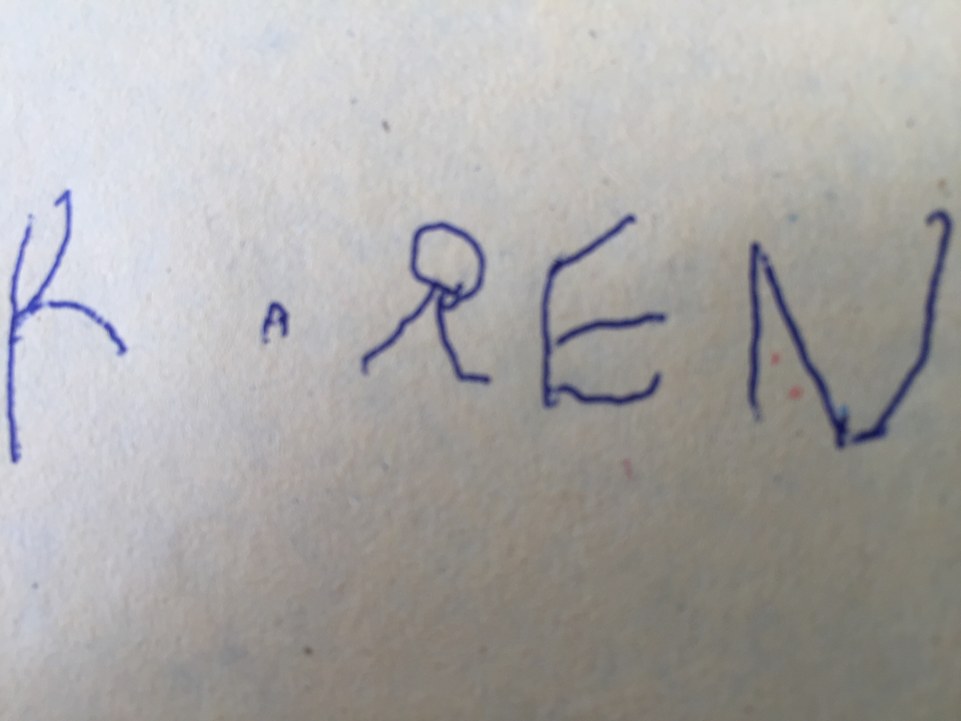 “A is for Pig” is a quote from Karen who is learning her letters. Karen is fascinated by animals, and skeletons. She enjoys drawing mermaids in great, anatomically-correct detail. Here is a picture I took of the first time she wrote her own name.
