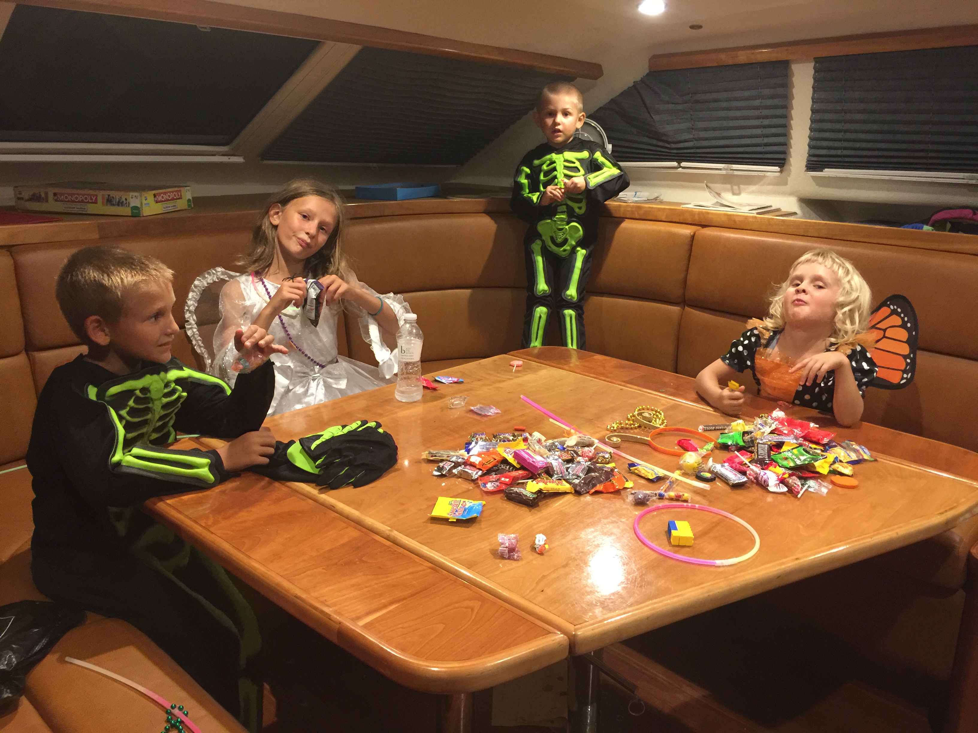 Chocolates began to melt. We returned back to our catamaran, SV Aphrodite. The kids inspected their haul. It was fun and, of course,  yummy – making it a universal Halloween experience.