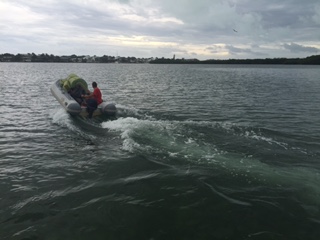Here are some pictures of Rick taking the old mattresses to shore, in the rain, by dinghy.