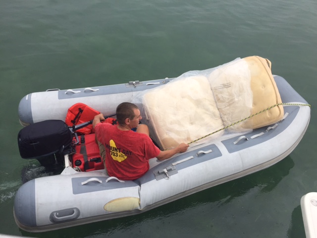 Before we left for the Bahamas we bought new mattresses for SV Aphrodite. How we disposed of the old ones and brought new ones aboard is worth documenting. We are anchored out. We bring everything across the water by dinghy.