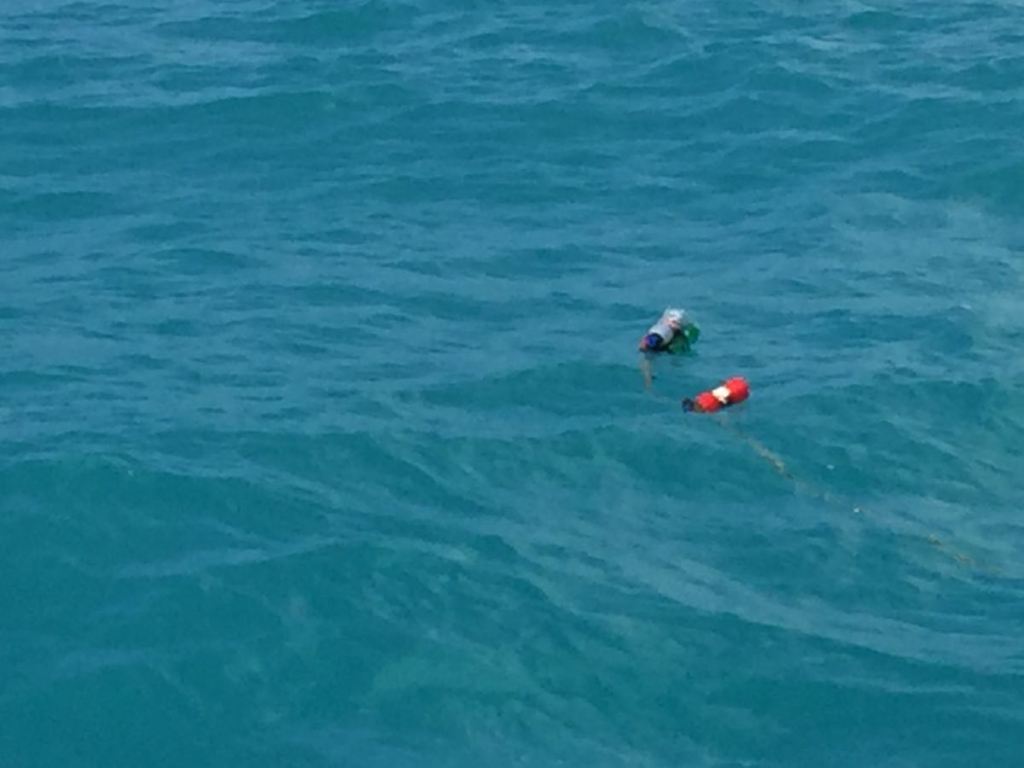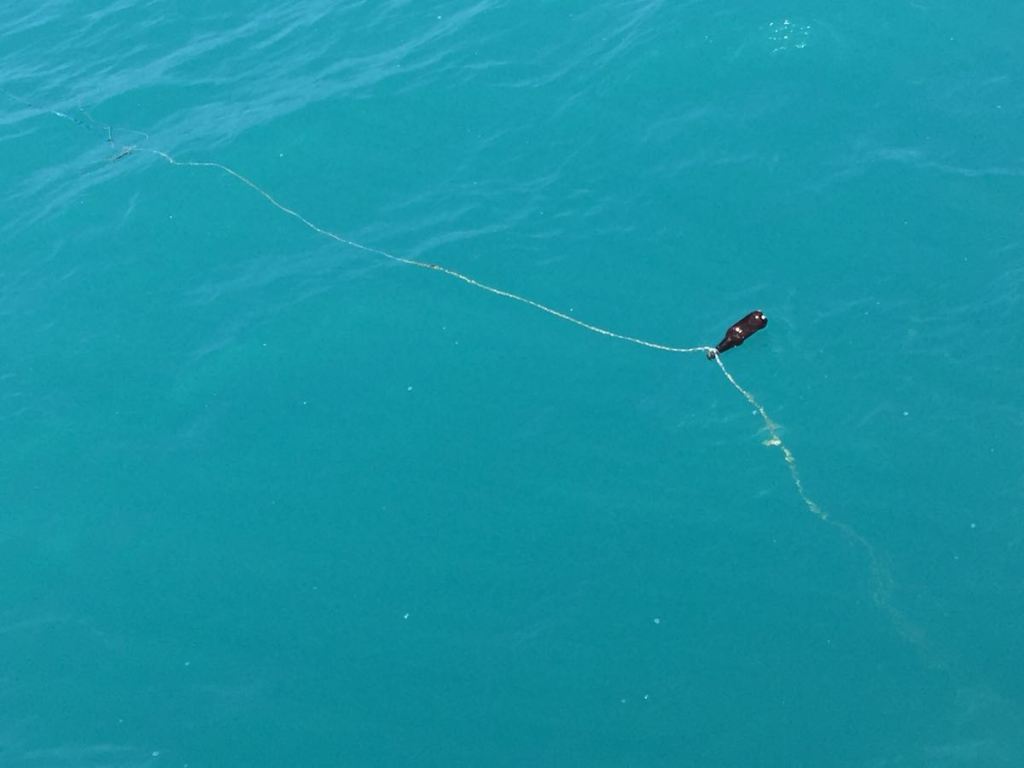 At daybreak, our pirates were definitely gone. We were in sheltered waters. We spotted bottles glinting on the surface of the water. Upon closer examination, these floating items seemed to be marking fish traps. Rick steered to avoid them.