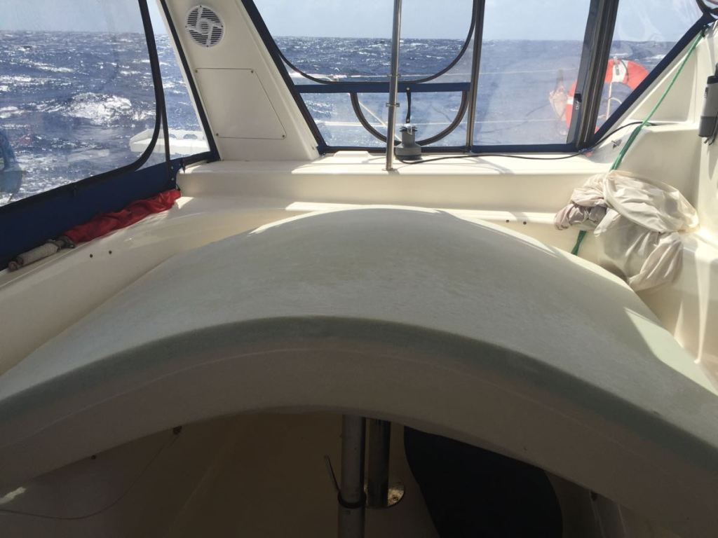 By day two, signs of sleep deprivation began. My husband slept during the day. While waves tossed about the boat, shuddering over the bow, my husband slept under a blanket. Water pounded over the trampolines and still he slept. Yet, at some point, he must have decided it was hot. And, perhaps he forgot he was on a sailboat in rough weather. He doesn’t remember doing this, but he seemed to have opened the hatch above his head. Perhaps a breeze fluttered across his cheek. All was well until a 10 foot wave saw an opportunity and pounced, right into the master berth.