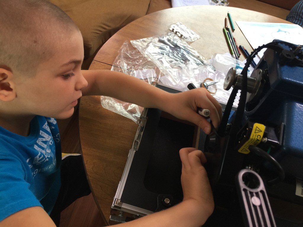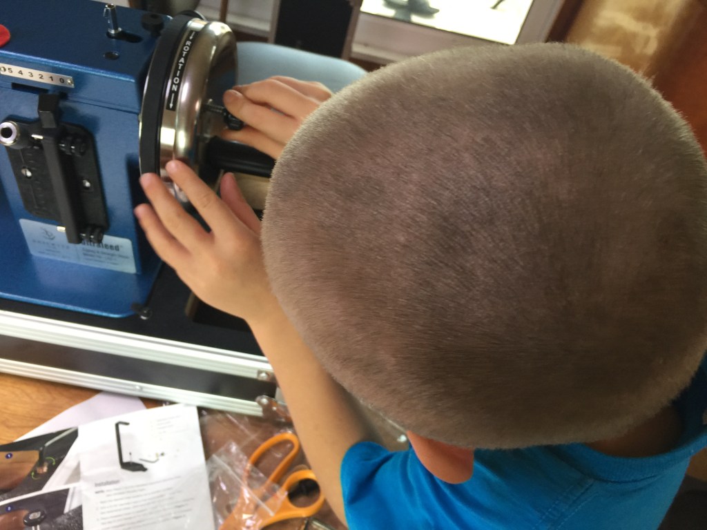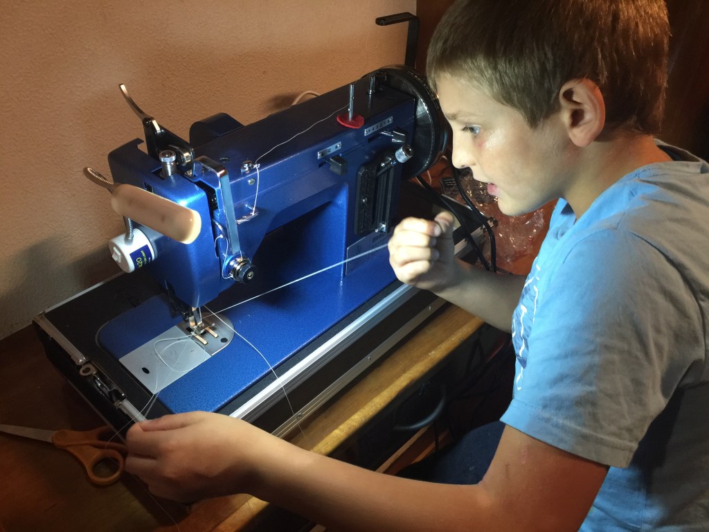 Tonight, we tried the machine for the first time. That meant we had to thread the machine. Henry was keen to test out what he learned in the videos.