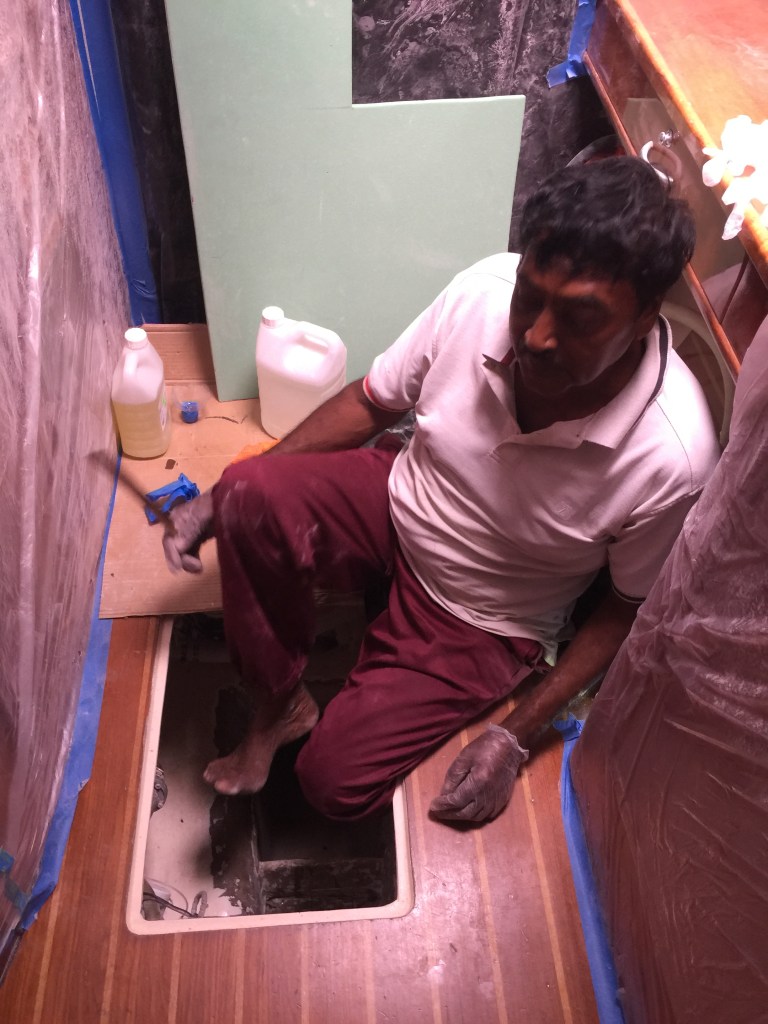 Another contractor stepped up to complete the job named Stephen Ramsahai. Everyone calls him “Sun”. He is amazing at matching gelcoat, and is not afraid to tackle the unknown. He works like a chef, tying all of his projects together. Sun spent days on our boat, listening to my children bicker, as he worked by himself in a very dusty room.