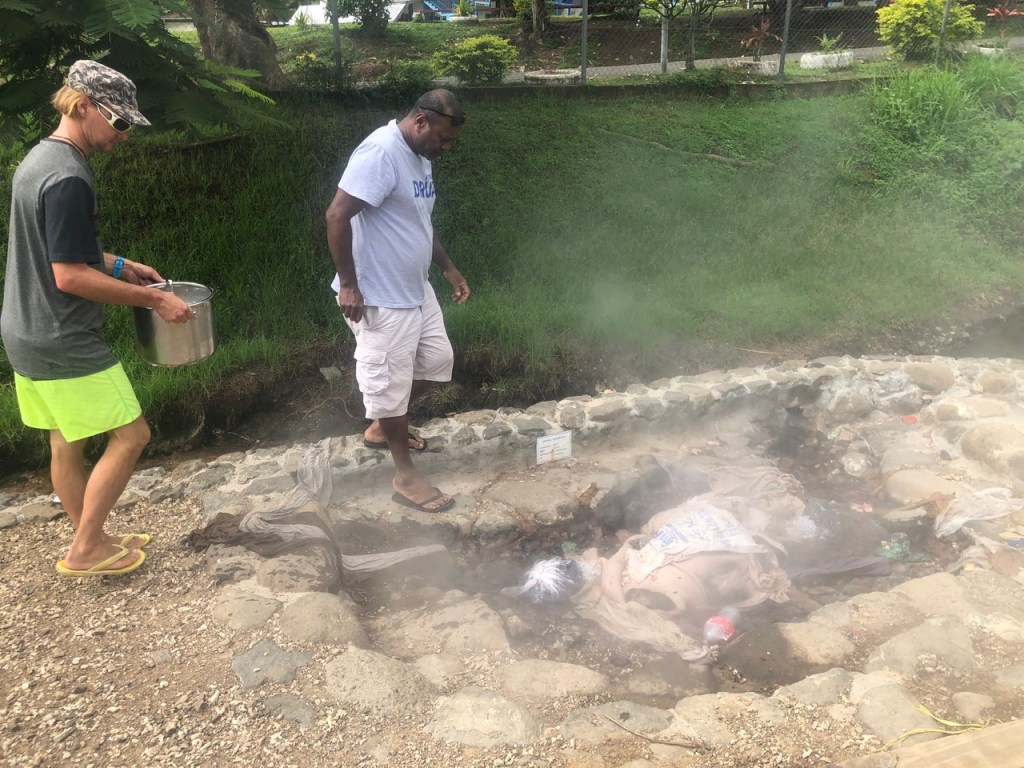 We found several people using the hot springs this morning, including one of our customs officials. He tells me he “cooks Cassava here every Sunday.” Cassava is a starchy root vegetable. When cooked, it is similar to a potato. When I ask him why he uses the hot springs to cook, he tells me it saves him on propane. He pulls his bag of boiled cassava from one of the springs and helps me better position my foil packages.
