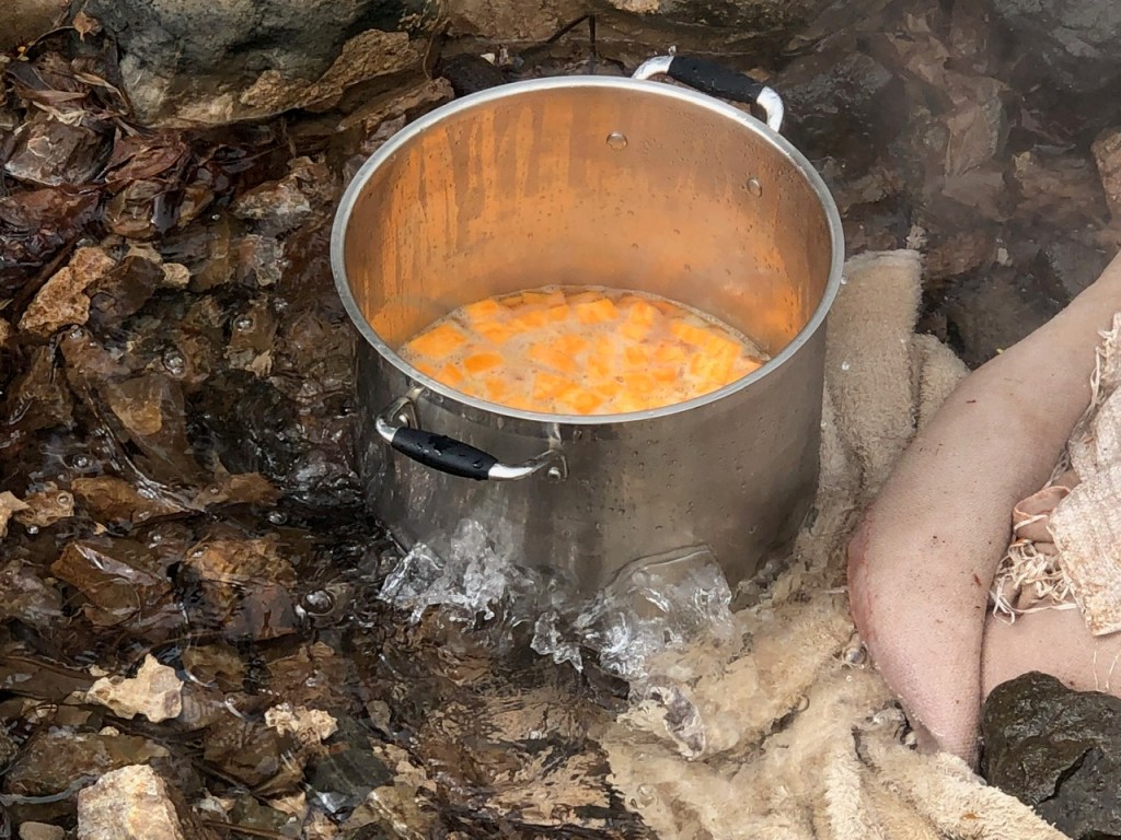 People cook this way in various countries, including geothermally active areas in New Zealand, Thailand, Azores, and Spain. In 2021, Gordon Ramsay made a short video when he cooked bread using a hot spring in Iceland. Baudy and bold, he stood at the shore of a body of water that was hot and bubbling. He then dug a hole in a berm to reach boiling water at the same level as the water in the background, put his pot in the hole, covered it with earth, and cooked bread. I’m torn as to whether the act of digging made for better, consistent heat, or better video content. As you can see, there is only so much mileage you can get of filming a pot boiling in water.