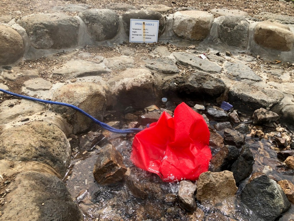 Today, the hot springs were dotted with random plastic wrappers and bits of garbage. I think the debris in the water must have arrived as part of the run off from the rain we’ve been having. I struggle with the idea that my food is being weighted down with some rags of various sizes. Goetz is quite sure that bacteria cannot survive these temperatures.