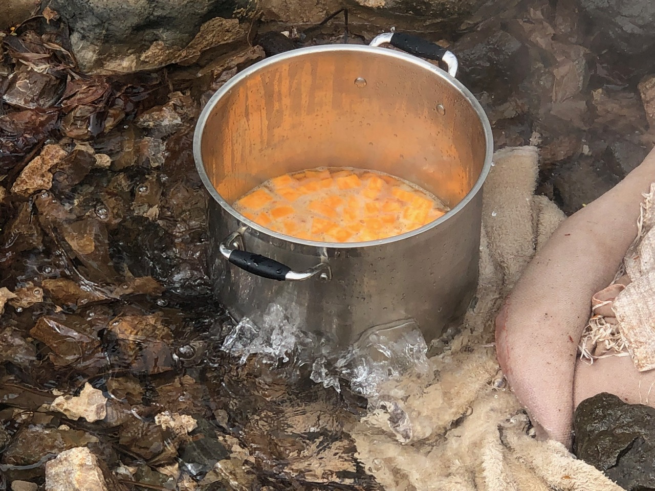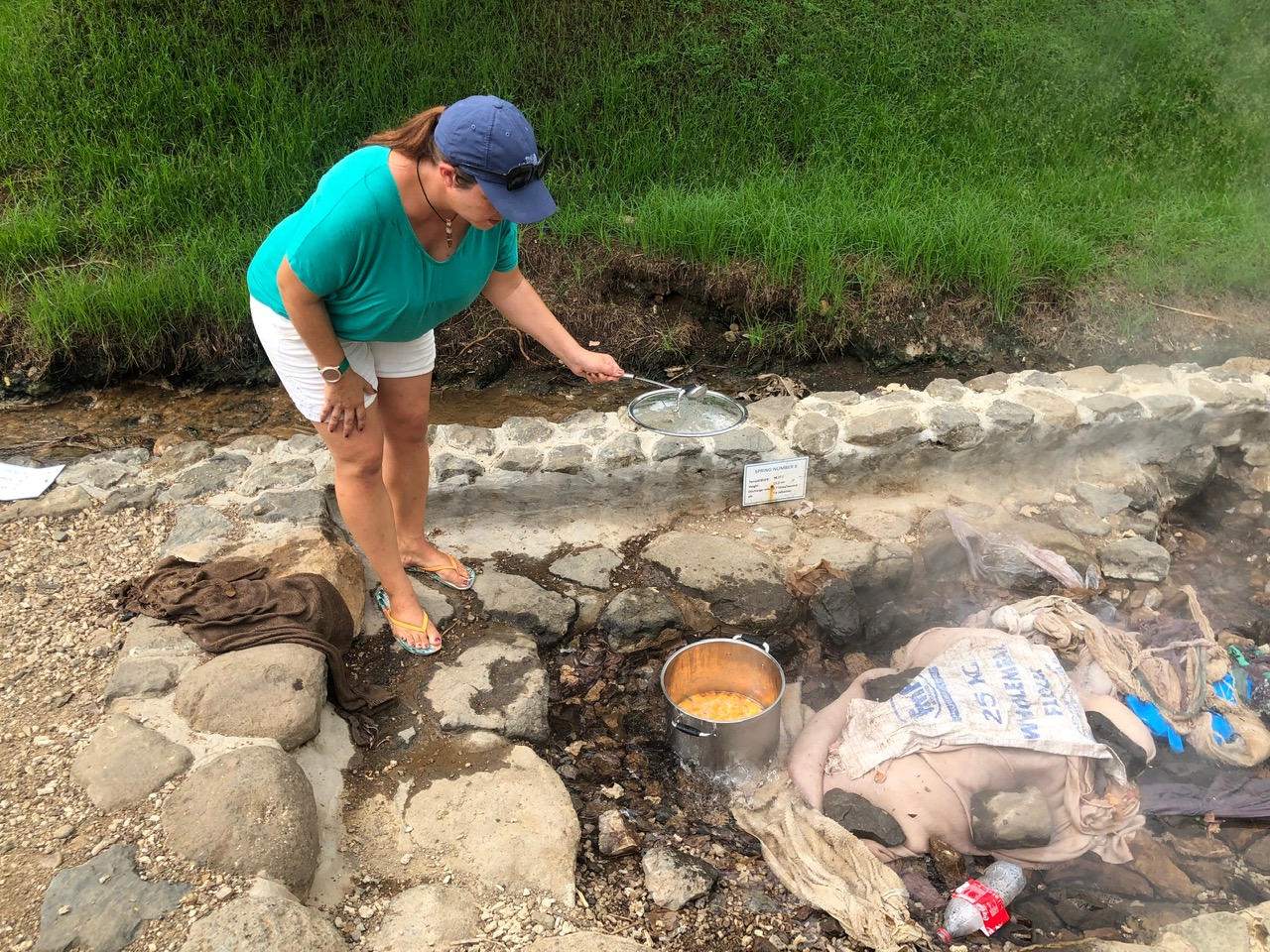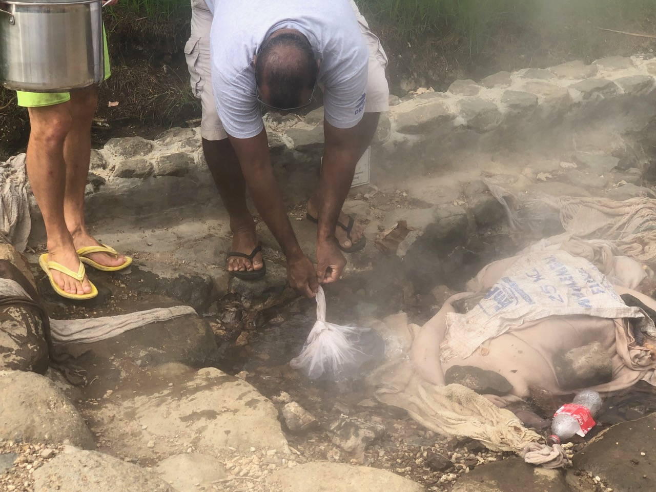 We found several people using the hot springs this morning, including one of our customs officials. He tells me he “cooks Cassava here every Sunday.” Cassava is a starchy root vegetable. When cooked, it is similar to a potato. When I ask him why he uses the hot springs to cook, he tells me it saves him on propane. He pulls his bag of boiled cassava from one of the springs and helps me better position my foil packages.