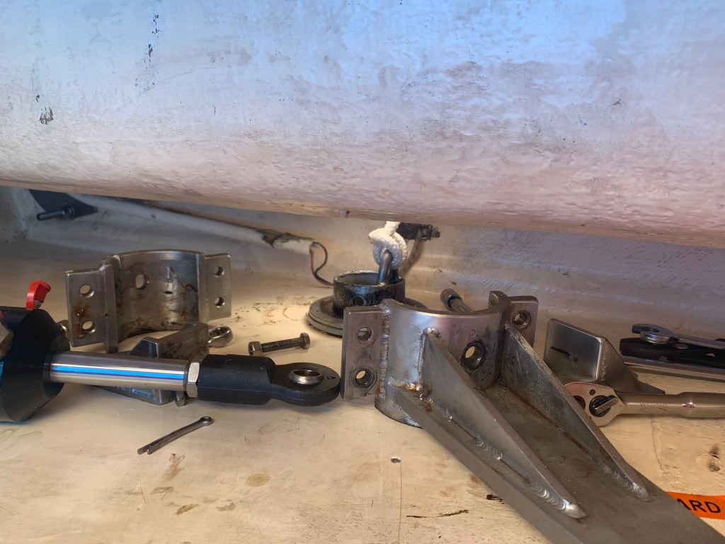 You might notice that we have a stainless-steel loop welded to the top of each of our rudder posts. The loops help to minimize the risk of losing a rudder during the removal process. They also help guide the rudder in and out of the rudder tube. The loop is not centered on the rudder post; Rick had them made to be offset to accommodate our emergency tiller arm.