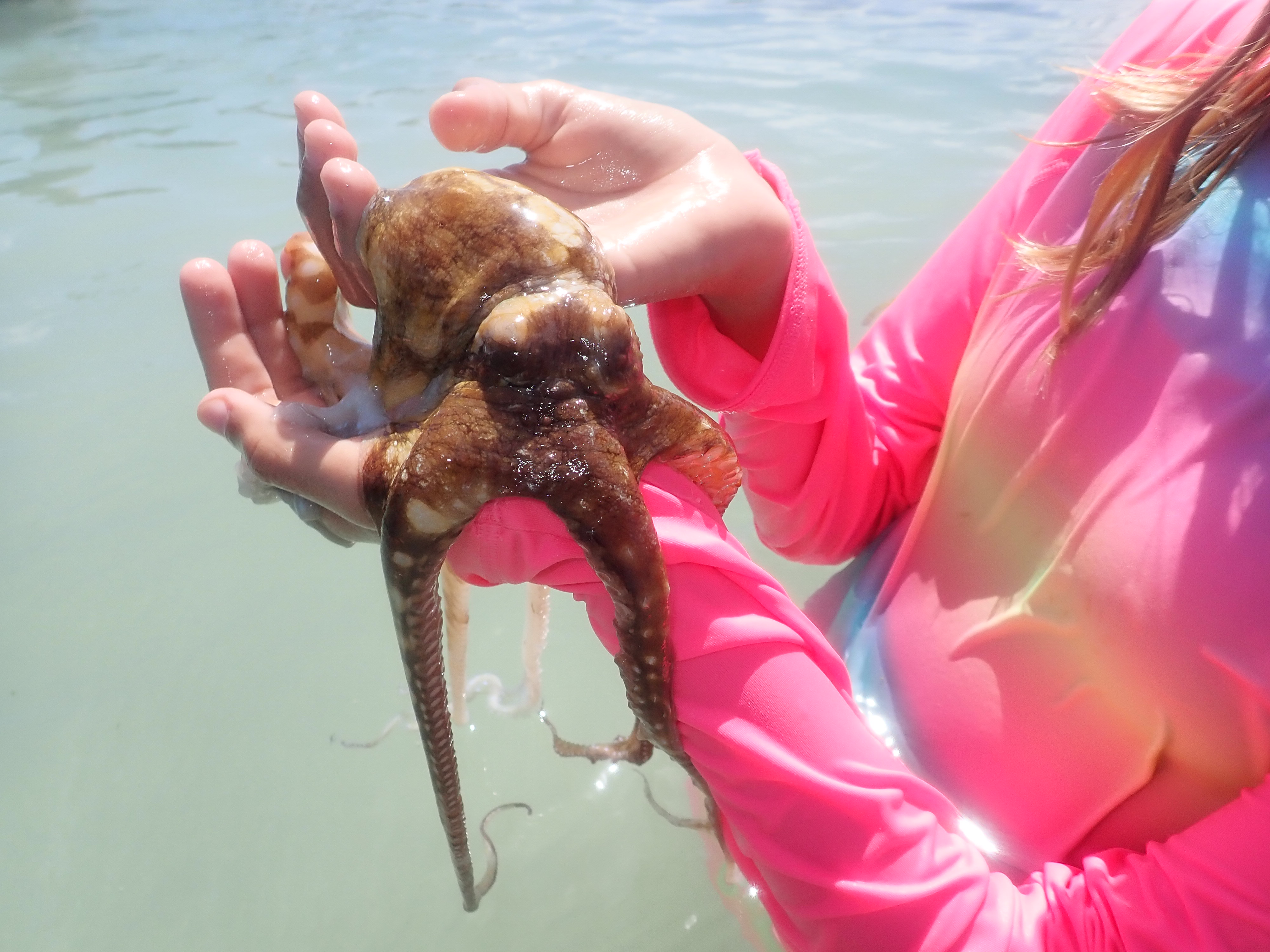 Then, the woman produced an octopus. It was small and writhing on her short spear. I told her that I had only ever seen three octopus in eight years. She said she finds one each time she fishes. They hide under the coral behind rocks. “They think we can’t see them, but I find them,” she said with a grin.