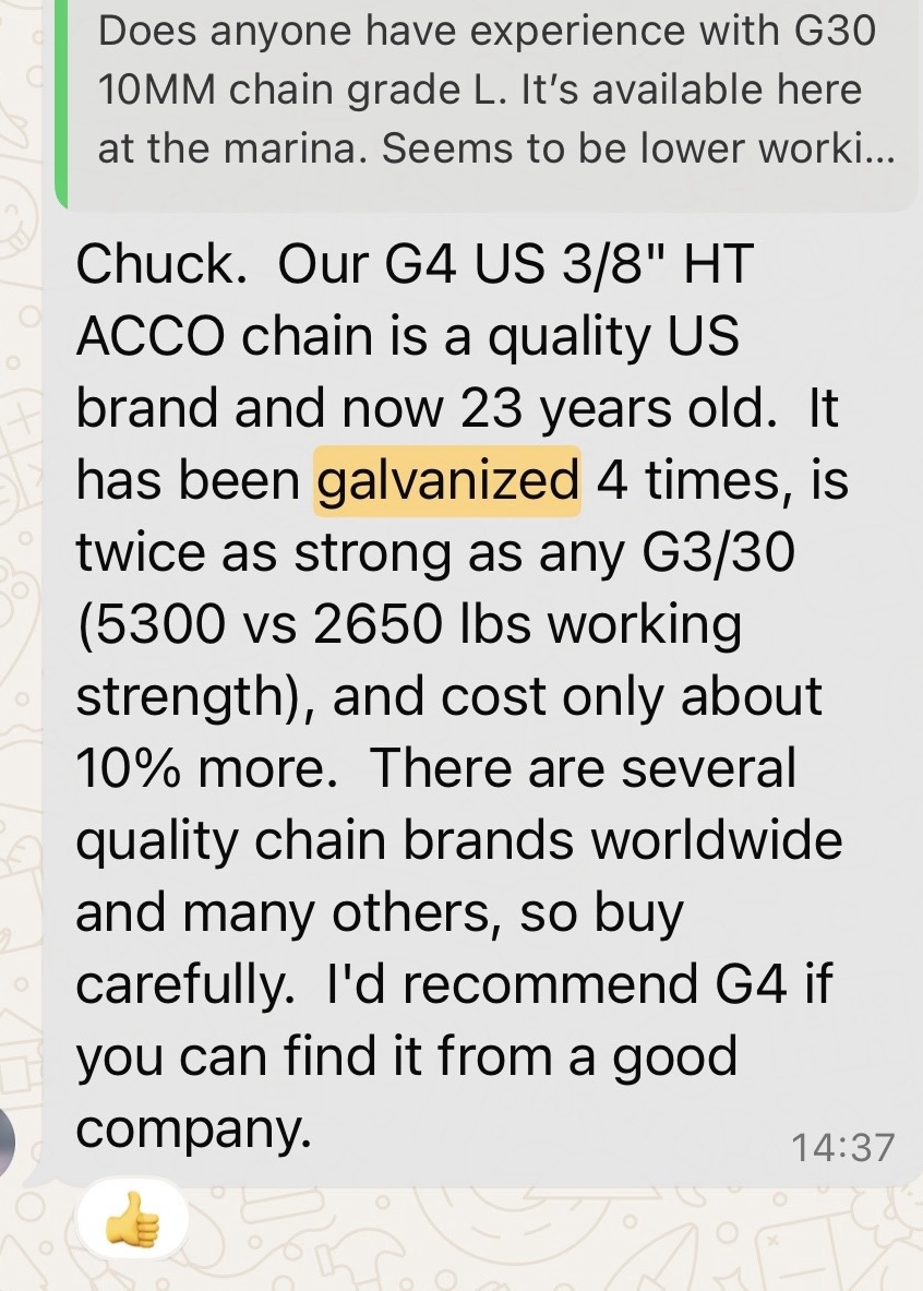 In truth, I don’t know what re-galvanizing means apart from your chain will look new and shiny. Perhaps there’s a belief that you could send your chain to be dipped into a vat of steaming steel and suddenly you have put at least another year of life onto your chain. It’s either that, or reorder new anchor chain.