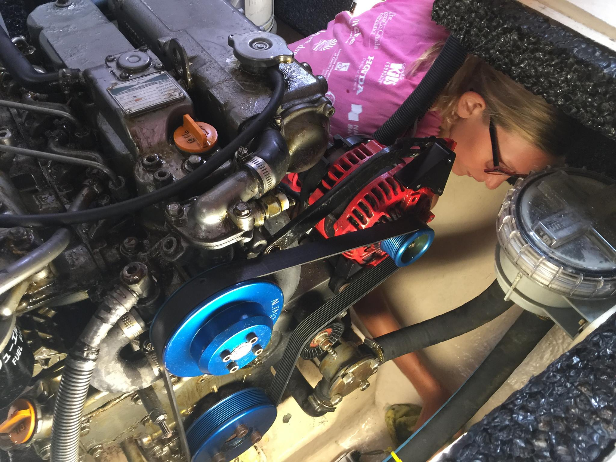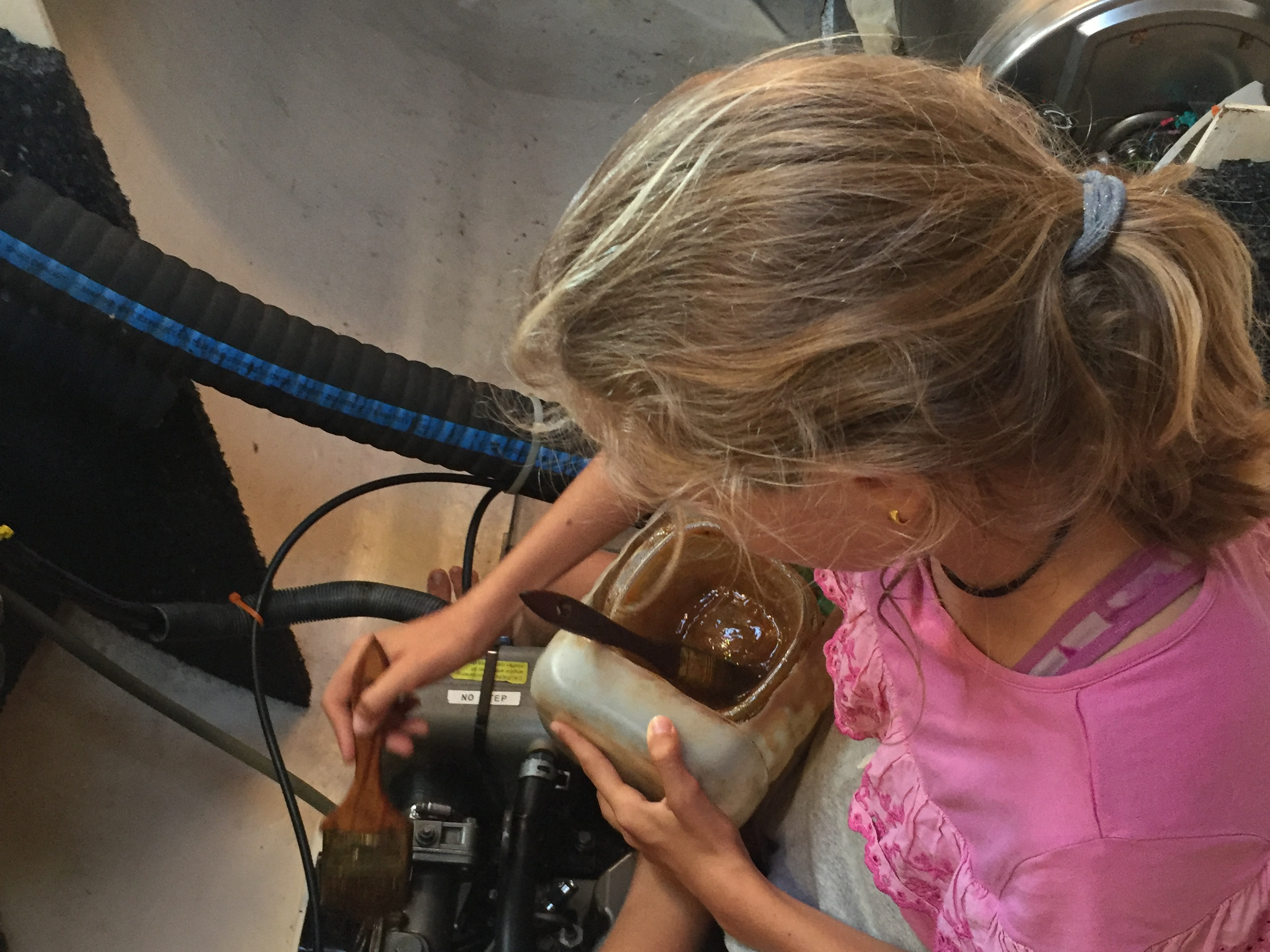 This is a regular job on SV Aphrodite. We have two engines. The engines are below the two aft beds. Cleaning involves crawling into tight spaces.