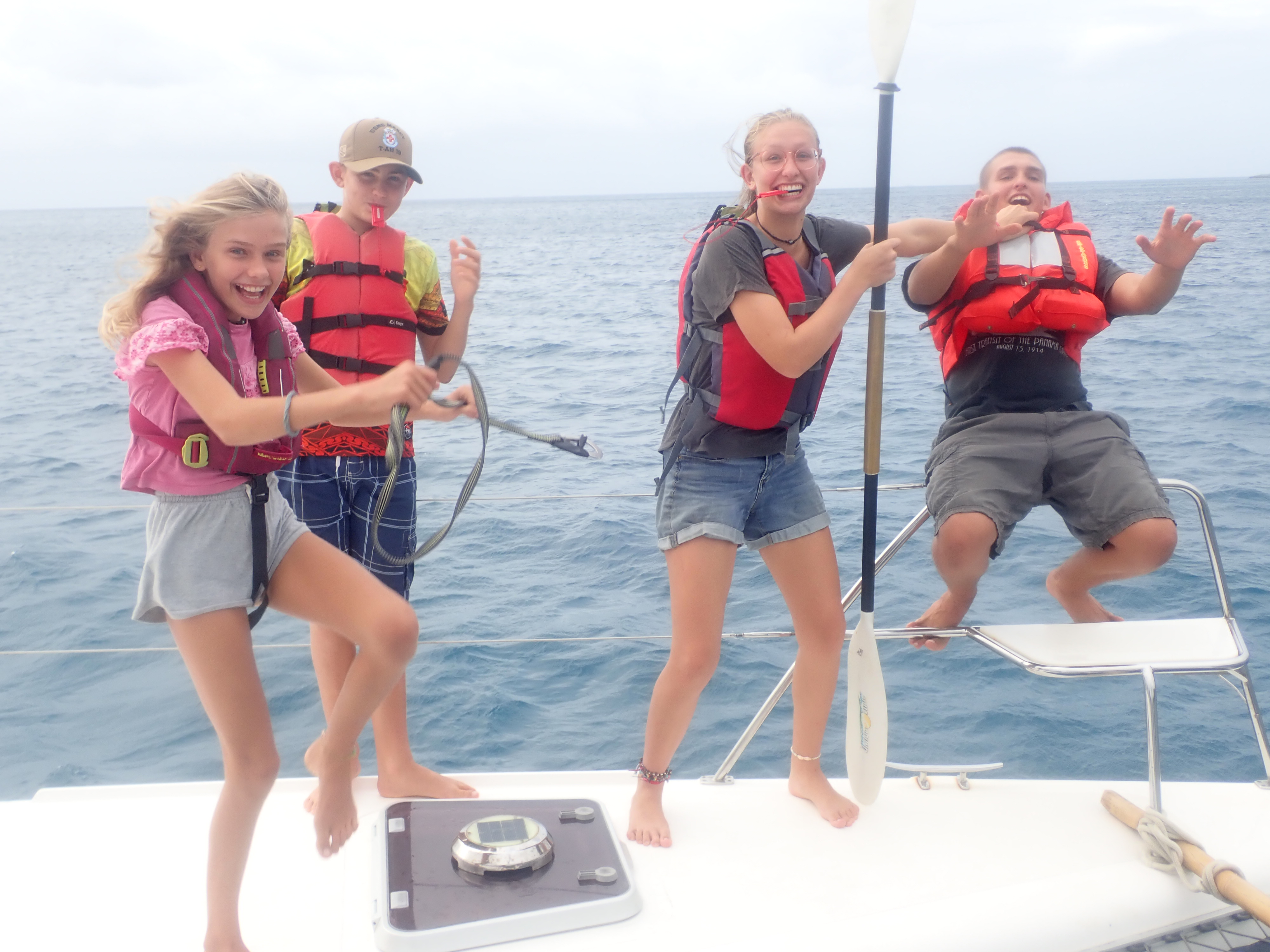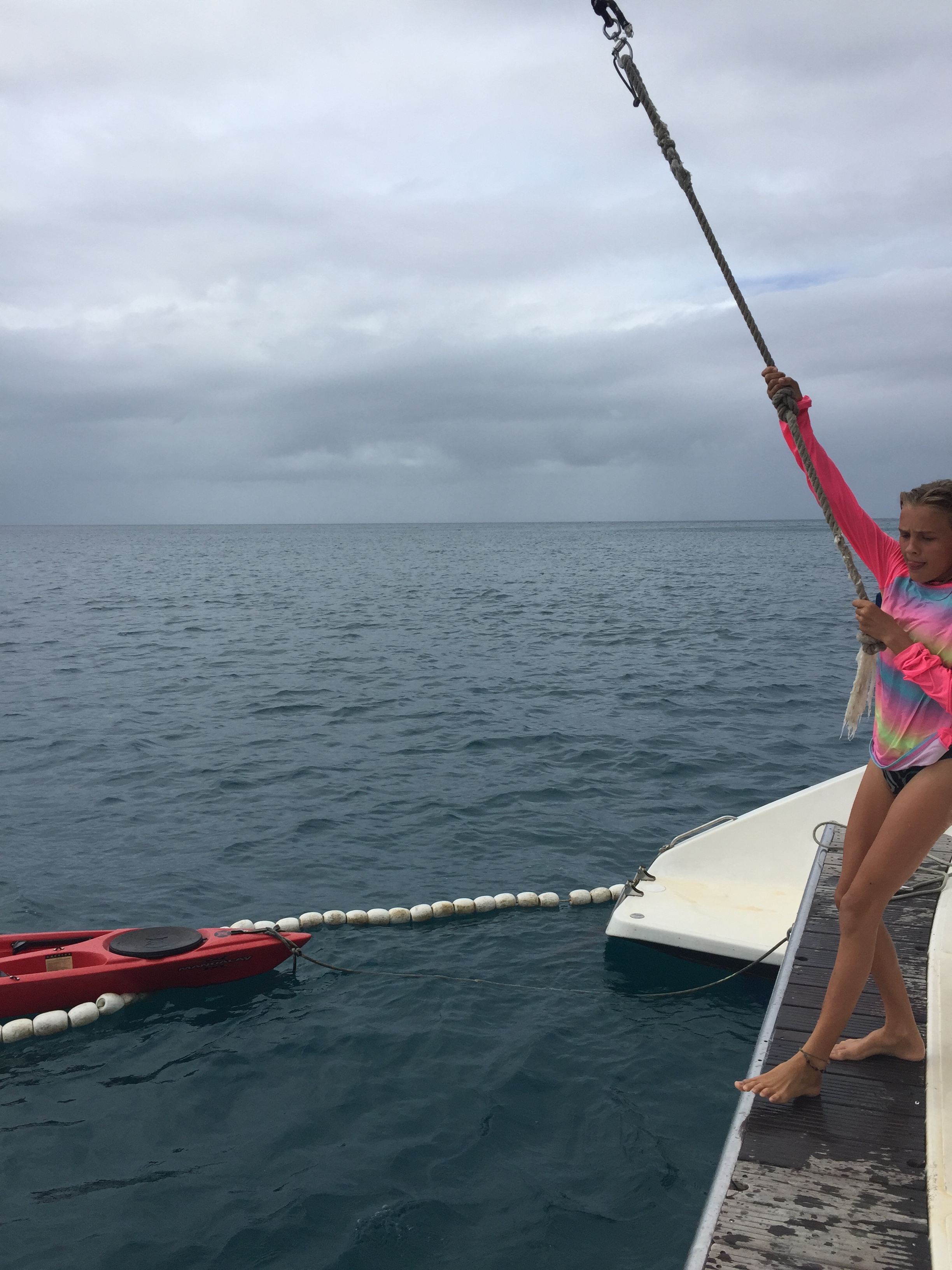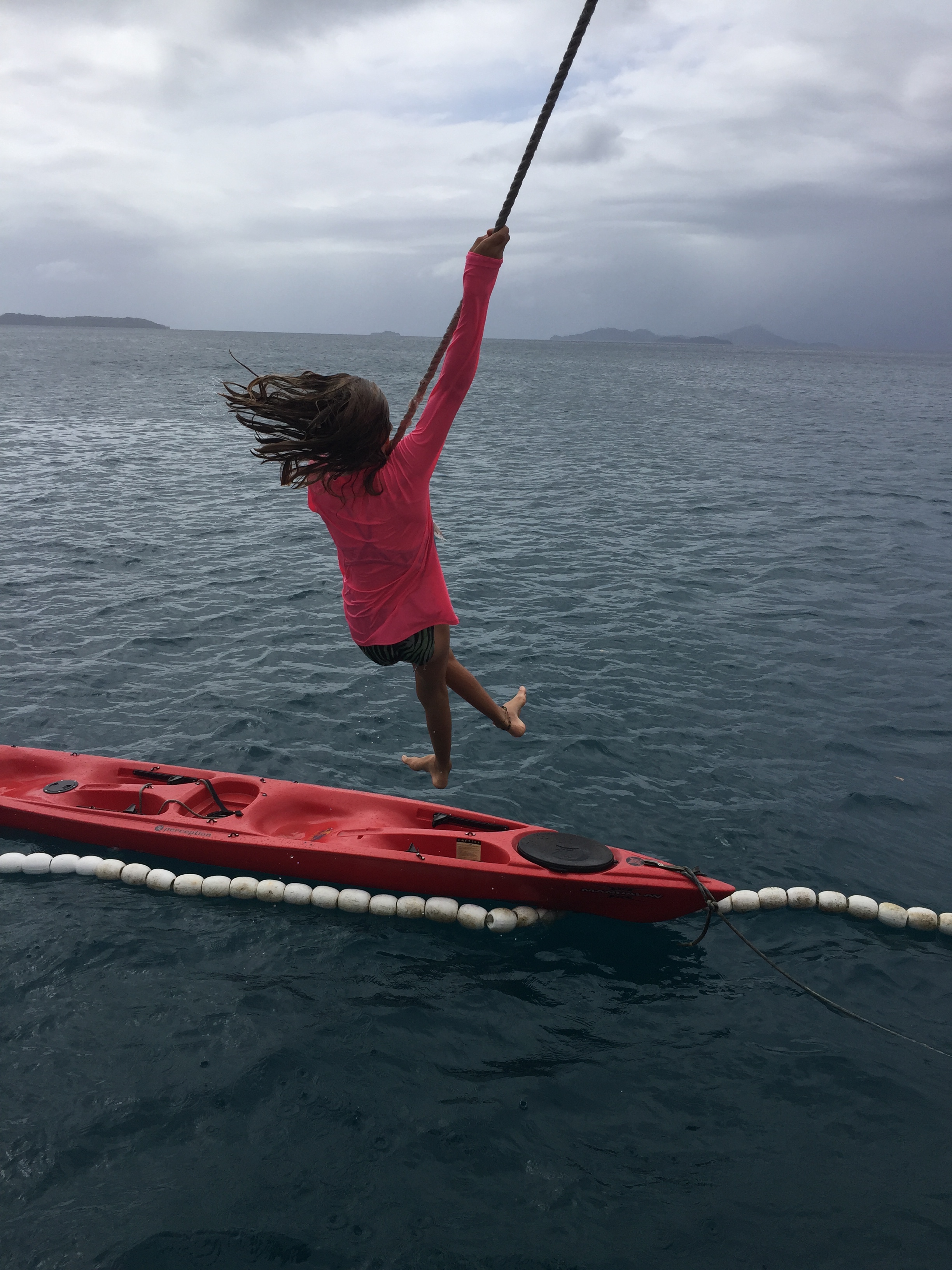 Refers to a rope that the kids use to swing into the water from the back of our boat. They perform various acrobatics including being upside down, spinning and diving from the rope. It used to be a challenge to go hand-over-hand to touch the top of the rope, but now they can do that with ease. Our first Tarzan rope was lost in Calvigny Cut, Grenada. We have replaced it with another Tarzan rope that we found on a shipwreck in Fakarava, French Polynesia.